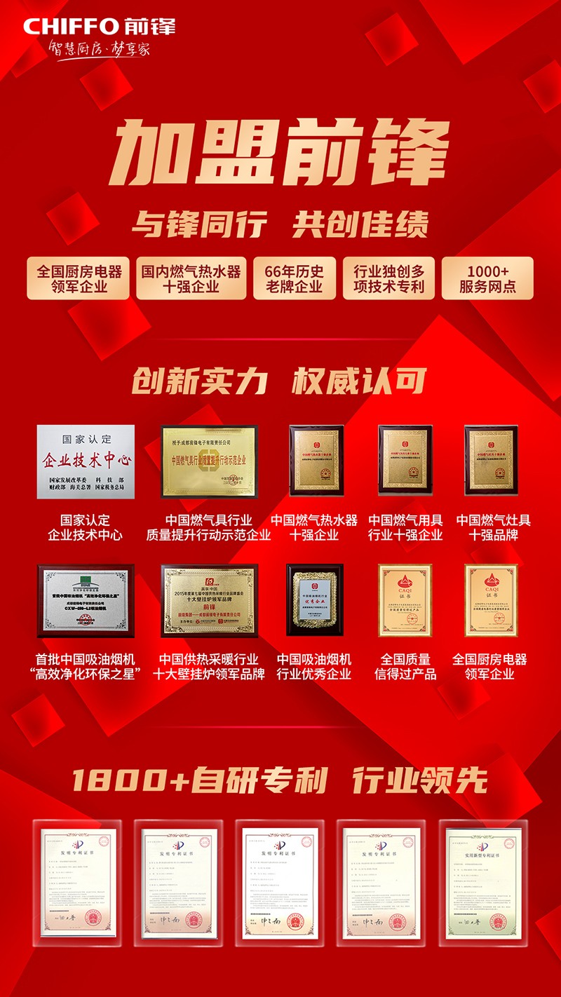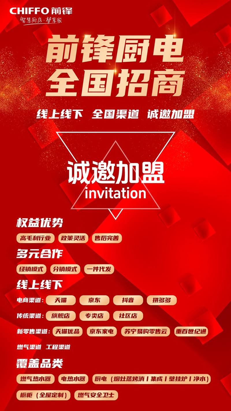 即日起,為了將前鋒廚電的產(chǎn)品和服務帶給更多的消費者,我們現(xiàn)正面向全國進行招商加盟。無論你是家電行業(yè)的資深人士,還是創(chuàng)業(yè)新手,只要你有夢想、有熱情,我們都歡迎你的加入!